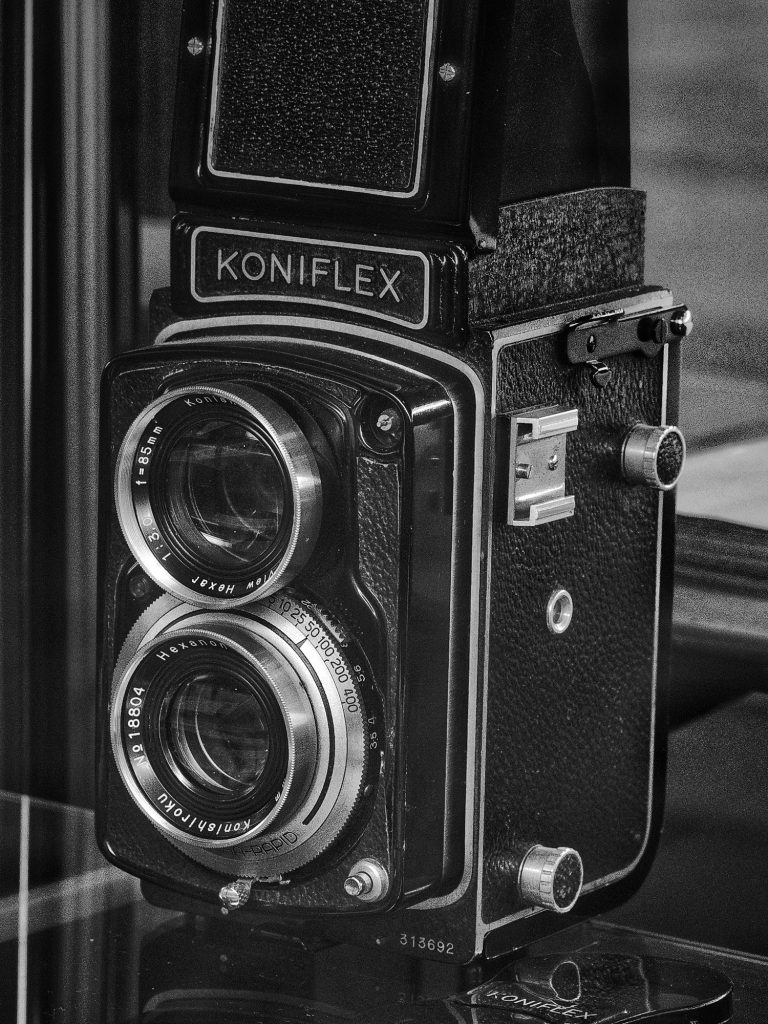松本から安曇野に行くと「アートライン」と呼ばれる一帯に、さまざまの美術館や博物館、記念館が点在しています。自然豊かで美しいこの地に多くの芸術家が居を構えたことも頷けます。そのような中で、山岳写真と蝶の細密画が展示されている「田淵行男記念館」を訪れました。自分自身は被写体を求めて高い山を登ったり、ひたすら耐えてしぶとくシャッターチャンスを待つような根性が全くないので山岳写真などはムリなのですが、作品を鑑賞すること自体は好きです。そこで展示されていた写真にも感動しましたが、撮影機材として飾られていたカメラに釘付けになりました。二眼カメラのコニフレックスと、最初期の一眼レフカメラになる旭光学アサヒフレックスです。山岳写真家はただでさえ嵩張る登山用具に加えて、こうした重い撮影機材を担いで山登りをするわけですから、いまからすれば、とんでもない苦行になります。それでも帯同したということは、並々ならぬ撮影意欲に促されてのものでしょう。たかが街歩き撮影で「少しでも重いカメラやレンズは嫌だ」と年じゅう文句を言っている自分には、たいそう形見の狭くなるような展示物でした。