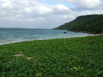 ハマヒルガオ(?)と白砂の海岸。絵葉書のような光景でした。沖縄離島のなかでも宮古島の砂浜は本当にきれいです。