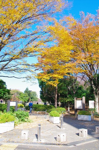 木場口の様子。紅葉・黄葉のカラフルな出迎えがありました。下町に住む人々にとっては、木場公園は貴重な憩いの場となっております。
