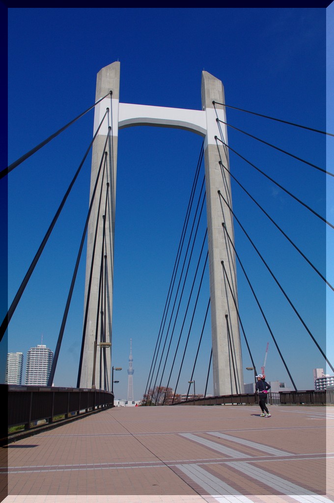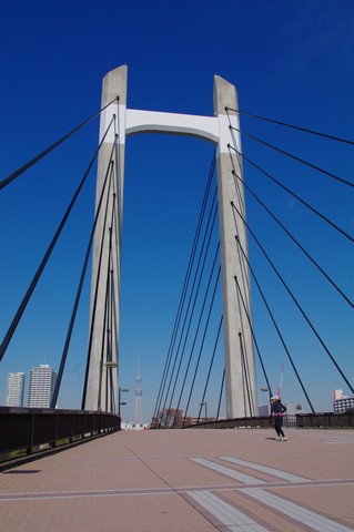 木場公園を真っ二つに分けているのが木場大橋。ジョギングや散歩する人々が行き交う向こうには、東京の新しいランドマーク、スカイツリー遠景が望めます。