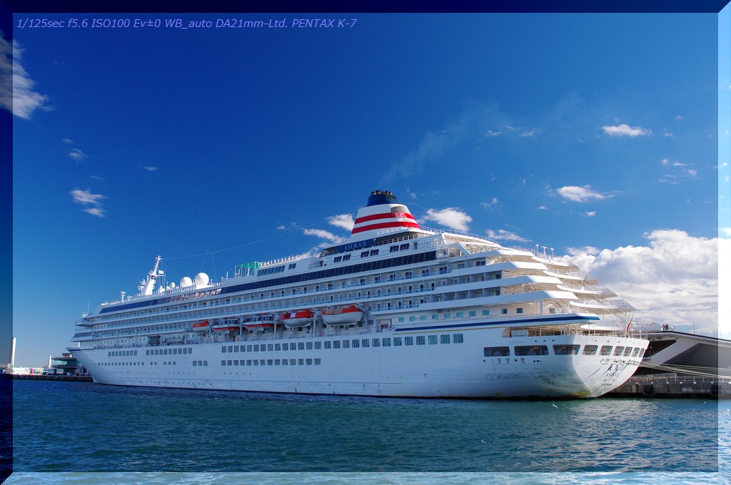 大桟橋に接岸している飛鳥II。とにかくデカいです!ここは広角でしか撮れそうにありません。F8まで絞れば全域でもう少しシャープになったはずです。空の青さを損なわぬようにPLフィルターを使ってみました。